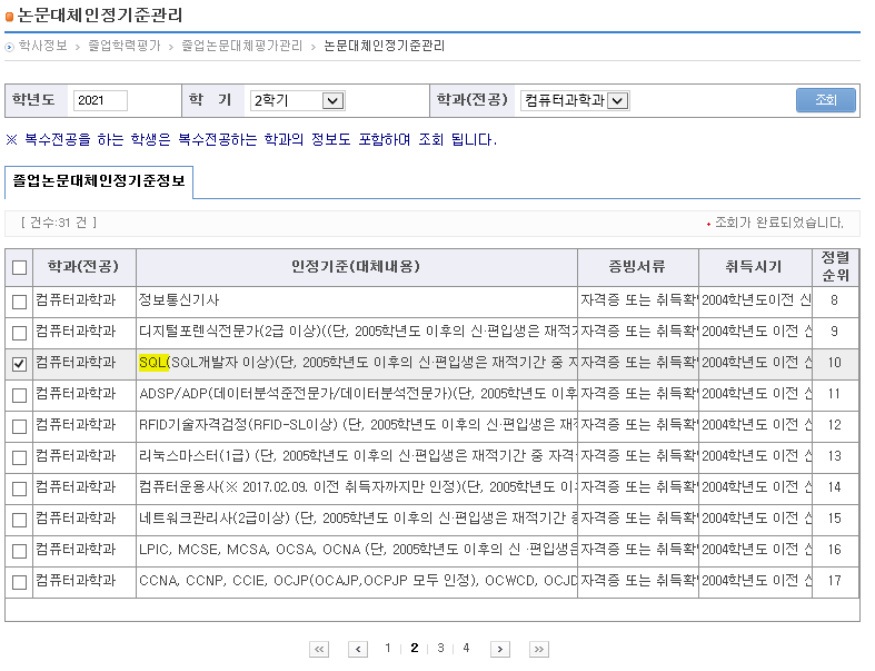 * SQL(SQL개발자 이상)(단, 2005학년도 이후의 신·편입생은 재적기간 중 자격을 취득한 경우에 한함)