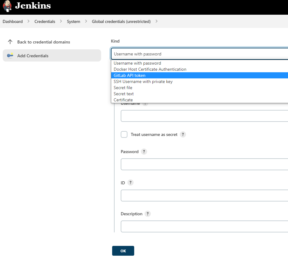 GitLab 토큰 등록 - Dashboard > Manage Credentials