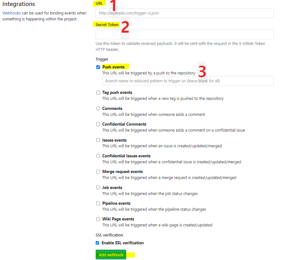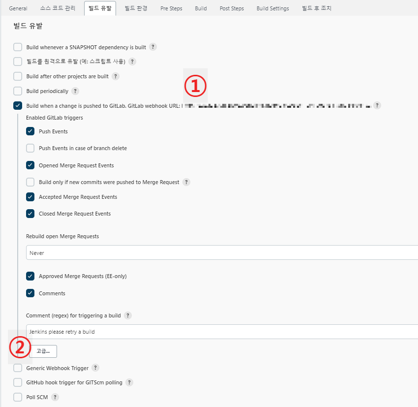 GitLab 설정의 1번에는 Jenkins의 1번을 입력해주면 되고, 2번에는 Jenkins의 고급>Secret token을 입력해주면 된다.