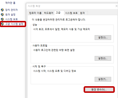 - 시스템 속성 창에서 '고급' 탭 → '환경 변수'를 클릭합니다.
