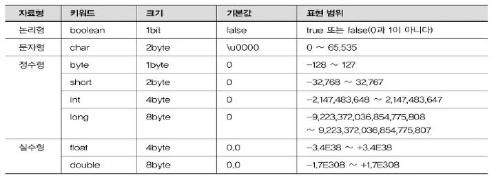 자바에서 자료형은 크게 기본 자료형과 참조 자료형으로 나눠집니다. 각 자료형은 표현할 수 있는 값의 범위가 다릅니다.
